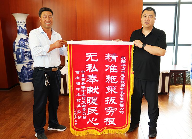 7月3日,靜寧縣曹務(wù)鎮(zhèn)黨委書記徐小勝、鎮(zhèn)政府梁濤、曹務(wù)鎮(zhèn)中莊村黨支部書記兼村委會主任霍小軍、曹務(wù)鎮(zhèn)柳岔村黨支部書記兼村主任柳和顯等一行4人到市惠民公司,代表靜寧縣曹務(wù)鎮(zhèn)黨委、鎮(zhèn)政府及中莊村、柳岔村,向市惠民公司敬贈錦旗,對惠民公司一直以來大力幫扶救助表示衷心感謝。市惠民公司黨委書記、董事長唐常寧代表公司接受錦旗,黨委委員、副總經(jīng)理鄭忠軍參加儀式。